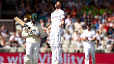 England great James Anderson marked becoming the first player to appear in 100 home Tests by leading the attack with three wickets as South Africa were dismissed for just 151 on Thursday's first day of the second Test at Old Trafford.