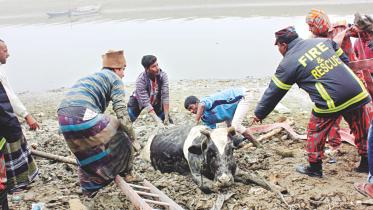 Firefighters and locals have pulled a cow free from quicksand on the bank of Padma river yesterday.