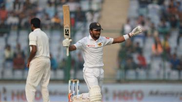 Skipper Dinesh Chandimal hit an unbeaten century as Sri Lanka reach 356-9 at stumps, trailing India by 180 runs on day three of the pollution-hit third Test in New Delhi.