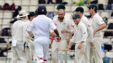 The duo of Nathan Lyon and Josh Hazlewood share three spoils each to snuff out Sri Lanka for a paltry117 in just 34.2 overs on Day 1 of the first Test at the Pallekele International Stadium.
