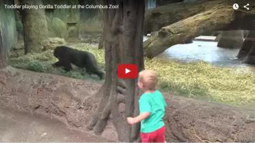 A gorilla just about his size decides he had enough sitting and begins to play peek-a-boo with his visitor.