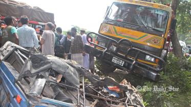 Five persons include three of a family are killed and 20 injured as two buses collide in Lalmonirhat Sadar upazila.