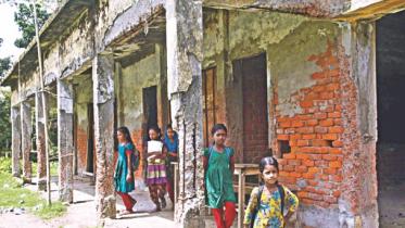 Risking their lives, over 200 students are attending classes at Dakkhin Kazir Howla Govt Primary School in Rangabali upazila, as the school building is in a bad state and it may collapse anytime.