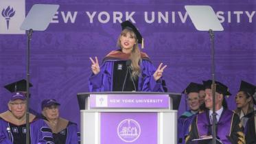 Taylor Swift received an honorary doctorate of fine arts from New York University on Wednesday, blowing kisses as the crowd roared when she walked toward the stage at a packed Yankee Stadium.