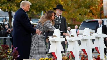 Trump visits Pittsburgh to console but stirs anger among protesters