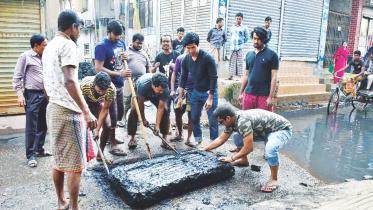Fed up with the authorities' failure to solve the prolonged waterlogging problem at Haji Khorshed Ali Sardar Sarak in the capital's East Jurain, locals have taken matters into their own hands.