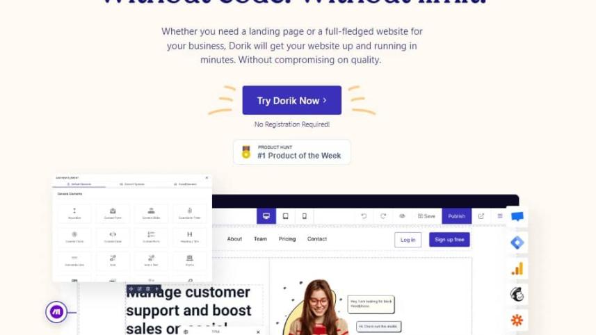 Dorik is flexible, easy-to-use, and one of the most affordable website-building platforms. It enables anyone to create a functional website in minutes without any design or coding experience. The platform helps agencies and professionals build websites for their clients with no coding required. It also offers a wide range of features and templates that can be customised to fit each client's needs.Additionally, users can brand the platform with their logo and colour scheme.