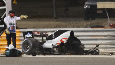 Lewis Hamilton won the Bahrain Formula One Grand Prix for Mercedes on Sunday after French driver Romain Grosjean had a miraculous escape from a fiery first lap crash that ripped his car in two.
