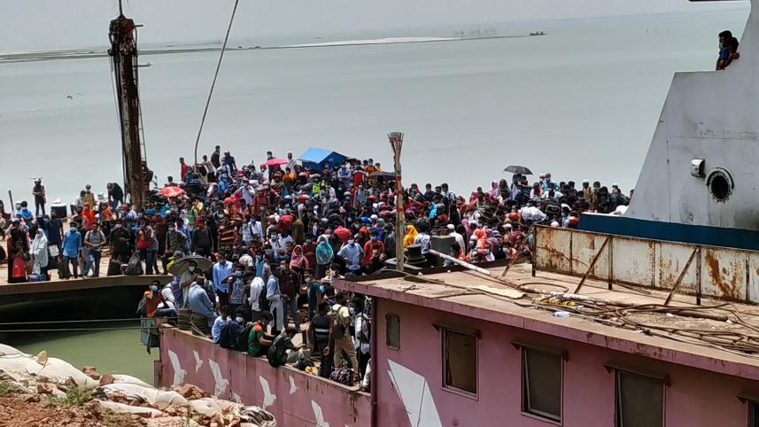 Despite the suspension of ferry services as per government directive, thousands of passengers were seen crowding at Paturia Ferry Terminal in Manikganj today.