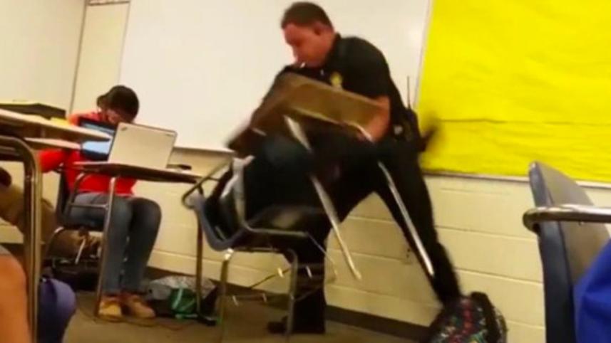 Video then shows the officer violently knocking the student down and pulling her across the floor.